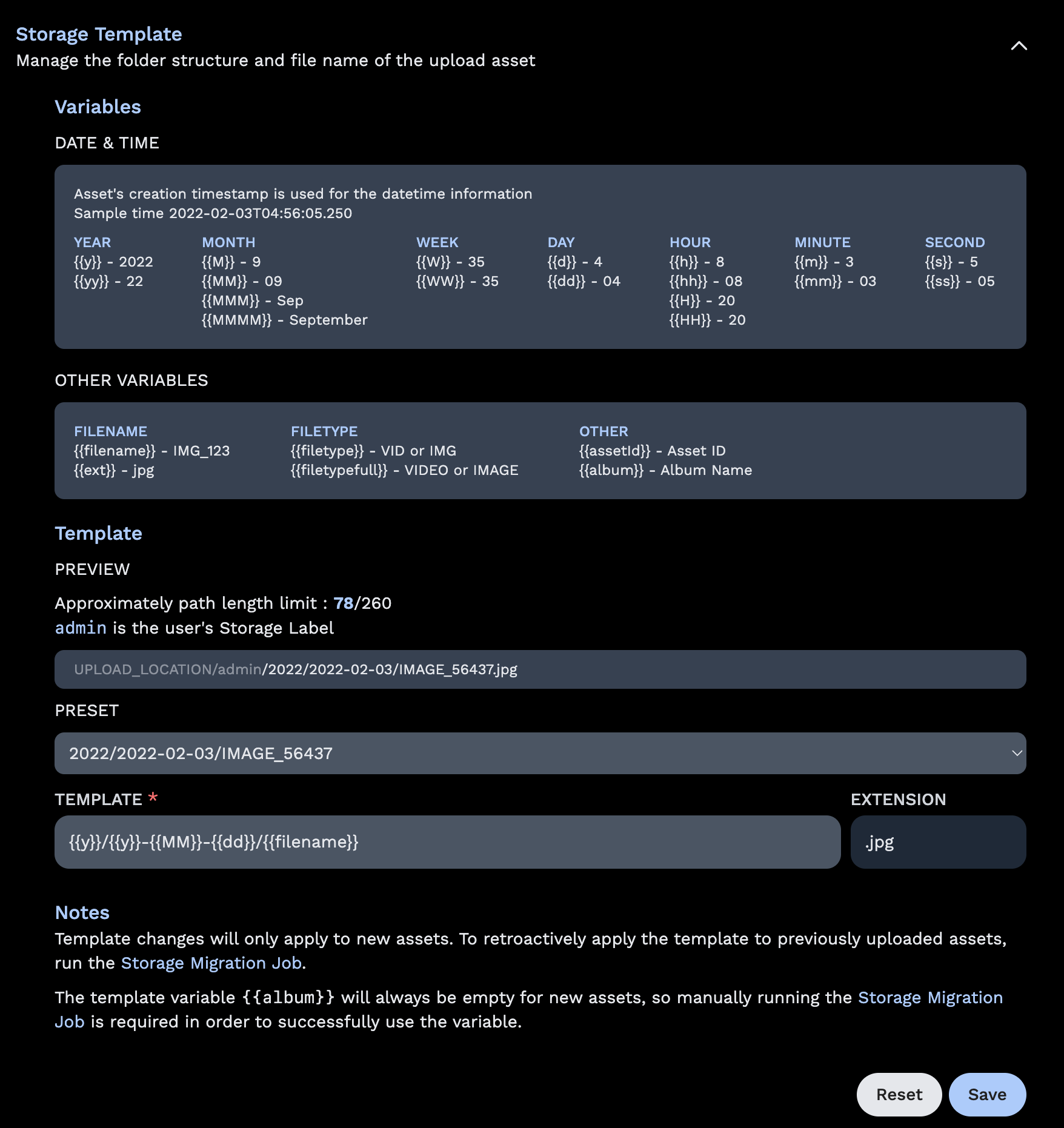 Immich also provides a mechanism to migrate between templates so that if the template you set now doesn't work in the future, you can always migrate all the existing files to the new template. The mechanism is run as a job on the Job page.