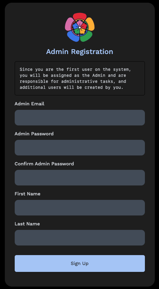 The first user to register will be the admin user. The admin user will be able to add other users to the application.