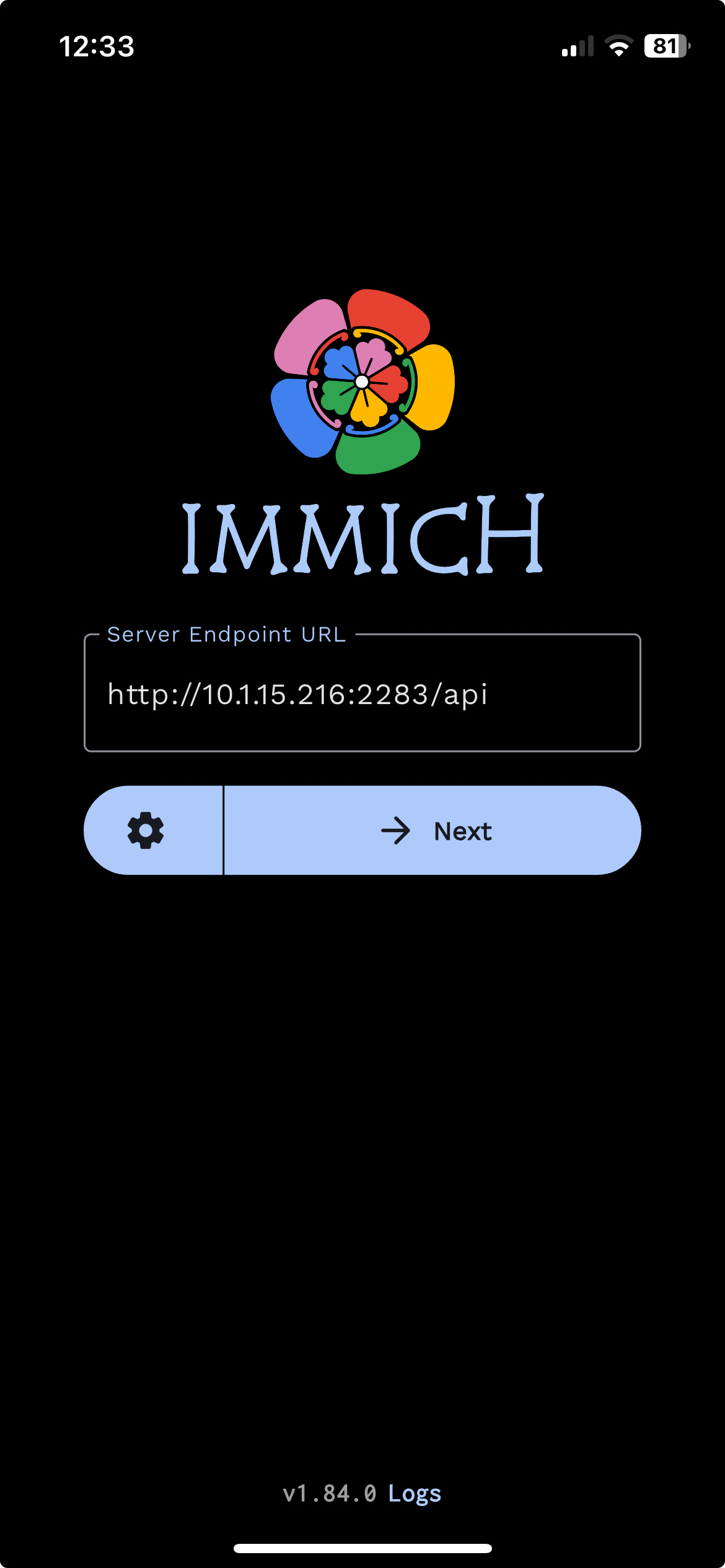 Login to the mobile app with the server endpoint URL at http://<machine-ip-address>:2283/api